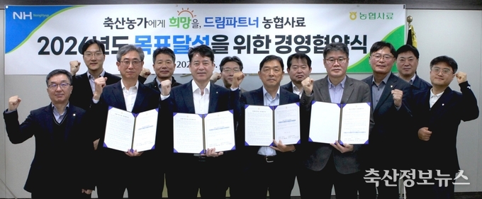 이날 최강필 농협사료 대표이사는 중소가축 분사장과 농협티엠알 대표이사, 농협우리사료 대표이사와 함께 경영협약을 체결했으며 판매 확대, 경쟁력제고 등 경영목표 달성을 다짐했다.