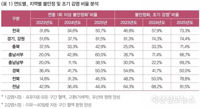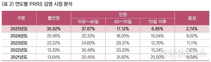 (표 1)의 불안정화 및 조기 감염을 포함한 감염 농가 비율은 2023년 약 47%에서 2024년 약 58%로 증가하였으며 2025년에는 약 73% 수준까지 증가하였다. (표 2)에서 이유~40일 구간(조기감염)에서의 비율도 매년 증가하였다. 이러한 변화는 농장 내 PRRS바이러스 전파가 이전보다 더 이른 시점에 이루어지고 있을 가능성을 보여준다.