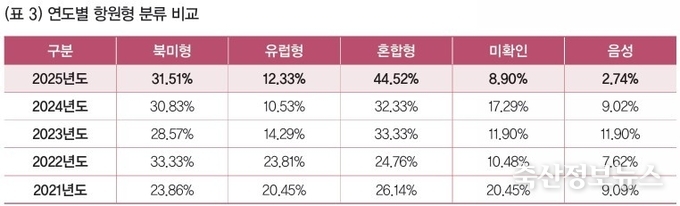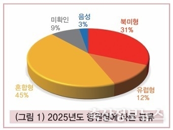 (표 3, 그림 1)의 PRRS 항원형 분석 결과를 보면 국내에서는 여전히 북미형 PRRS바이러스의 단독감염과 혼합형(북미형+유럽형) 감염이 높은 비율을 차지하고 있다. 최근 분석 결과 북미형 약 32%, 유럽형 약 12%, 혼합 감염 약 45% 수준의 분포를 보였다. 특히 혼합 감염 비율이 높다는 점은 한 농장에서 두 가지 이상의 PRRS바이러스가 동시에 존재하는 상황을 의미한다. 이러한 경우 바이러스 재조합 가능성이 증가하고 질병 관리가 더욱 어려워질 수 있다. 또한 백신 프로그램 운영 시에도 예상과 다른 결과가 나타날 수 있어 농장관리 전략 수립 시 중요한 요소가 된다.