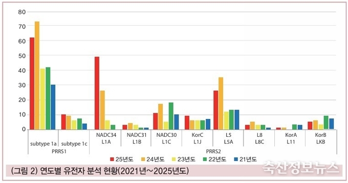 PRRS 유전자 분석 결과에서도 최근 국내 PRRS 유행 변화가 확인된다. 분석된 PRRS바이러스 중에서는 북미형 PRRS바이러스가 더 높은 비율을 차지하였으며, 특히 Lineage 1 계열 바이러스가 매년 높은 비율로 증가하고 있다. 국내에서 발생하는 Lineage 1 계열에는 NADC34-like(L1A), NADC31-like(L1B), NADC30-like(L1C) 등이 있으며, 이 가운데 NADC34-like(L1A) 바이러스의 발생률은 최근 2년간 매우 높게 증가하고 있다. NADC34-like(L1A) 바이러스는 북미에서 처음 보고된 이후 최근 중국에서 확산하고 있는 Lineage 1 계열 바이러스로, 최근 국내에서도 확인되면서 PRRS 유행 변화의 원인 중 하나로 주목받고 있다.