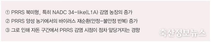 이러한 변화는 PRRS바이러스가 농장 내 신규 유입으로 인한 질병 발생도 있지만, 최근에는 농장 내에서 바이러스가 지속해서 순환하는 농장이 증가하고 있음을 의미한다. 특히 이러한 경향은 특정 지역에 국한되지 않고 경기·강원, 충청, 전라 등 여러 지역에서 공통으로 나타나고 있다.