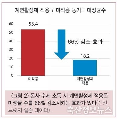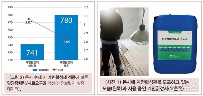 이러한 환경의 변화는 수치로도 명확히 증명된다. 계면활성제를 사용한 돈사는 미적용 농장 대비 대장균 수가 66% 감소하며, 이는 눈에 보이지 않는 오염원을 농가가 통제 가능한 수준으로 낮추는 결과를 가져온다. 깨끗한 환경에서 자란 돼지는 질병 스트레스를 덜 받는 만큼 성장에만 에너지를 집중할 수 있게 된다. 실제 선진브릿지 실증 데이터에 따르면, 이는 사료요구율(FCR)을 3.07에서 2.85로 0.22 개선하는 성적의 변화로 나타난다.
