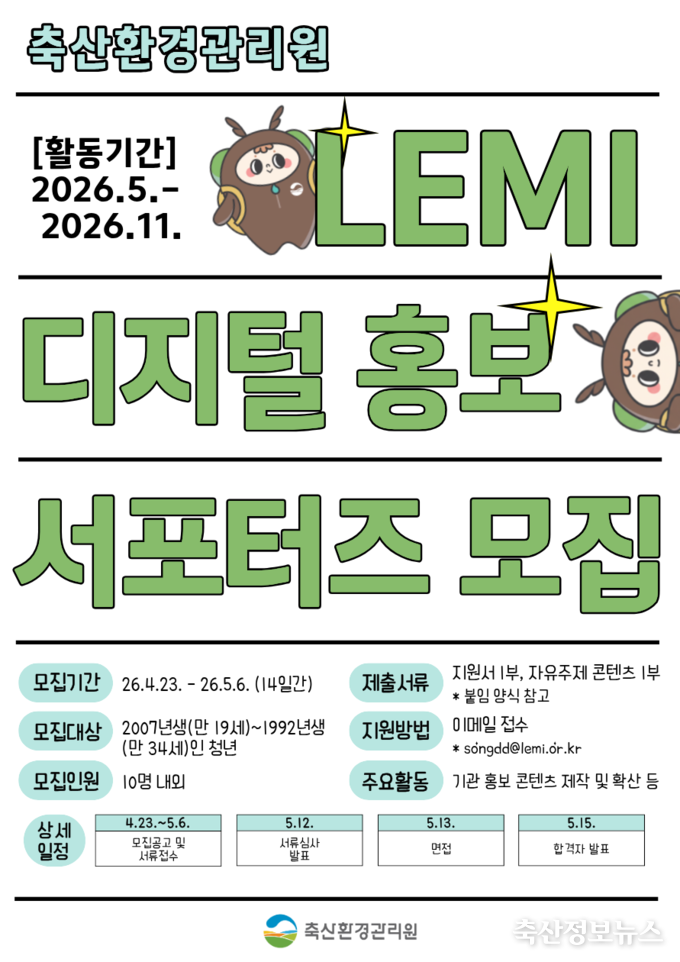 축산환경관리원(원장 문홍길)은 청년의 시각에서 축산환경 정책을 국민에게 더 쉽고 재미있게 전달하기 위해 ‘2026 LEMI 디지털홍보 서포터즈’를 4월 23일부터 5월 6일까지 모집한다고 밝혔다.